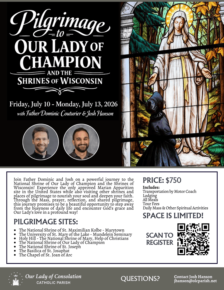 Join Father Dominic and Josh Hanson on a powerful journey to the National Shrine of Our Lady of Champion and the Shrines of Wisconsin! Experience the only approved Marian Apparition site in the United States while also visiting other shrines and places of pilgrimage to nourish your soul and deepen your faith. Through the Mass, prayer, reflection, and shared pilgrimage, this journey promises to be a beautiful opportunity to step away from the busyness of daily life and encounter God’s grace and Our Lady’s love in a profound way!