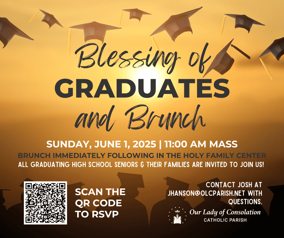 The Tuesday Mass, that usually begins at 7 PM, will start at 6:30 PM due to the OLC 8th Grade Graduation. Confession on June 3rd will be from 5-6 PM.