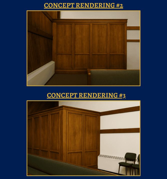 These renderings are the Confessionals to be built in the church, located in the southwest and northwest corners. The designs allocate a room for the priest and a separate room for the penitent. The rooms allow for face-to-face interaction or through a closed screen.
