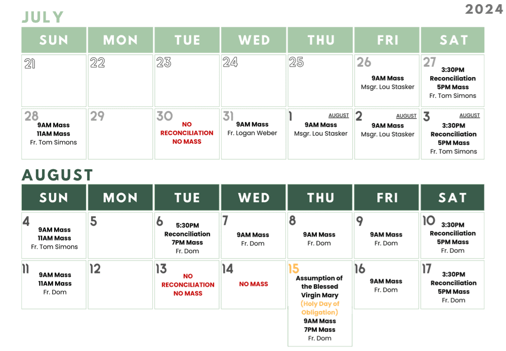 The most accurate, up-to-date information, is on our parish website calendar. Please double-check this online calendar to make sure Mass, Reconciliation, and other events are still scheduled.