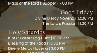 In this message: April 17-20: Triduum and Easter April 18-27: Divine Mercy Novena April 19: KEPHA Rosary April 23: NO…