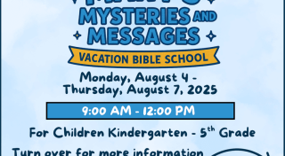 Vacation Bible School: August 4-7 REGISTER HERE Children who are entering Kindergarten through 5th grade are invited to join us…